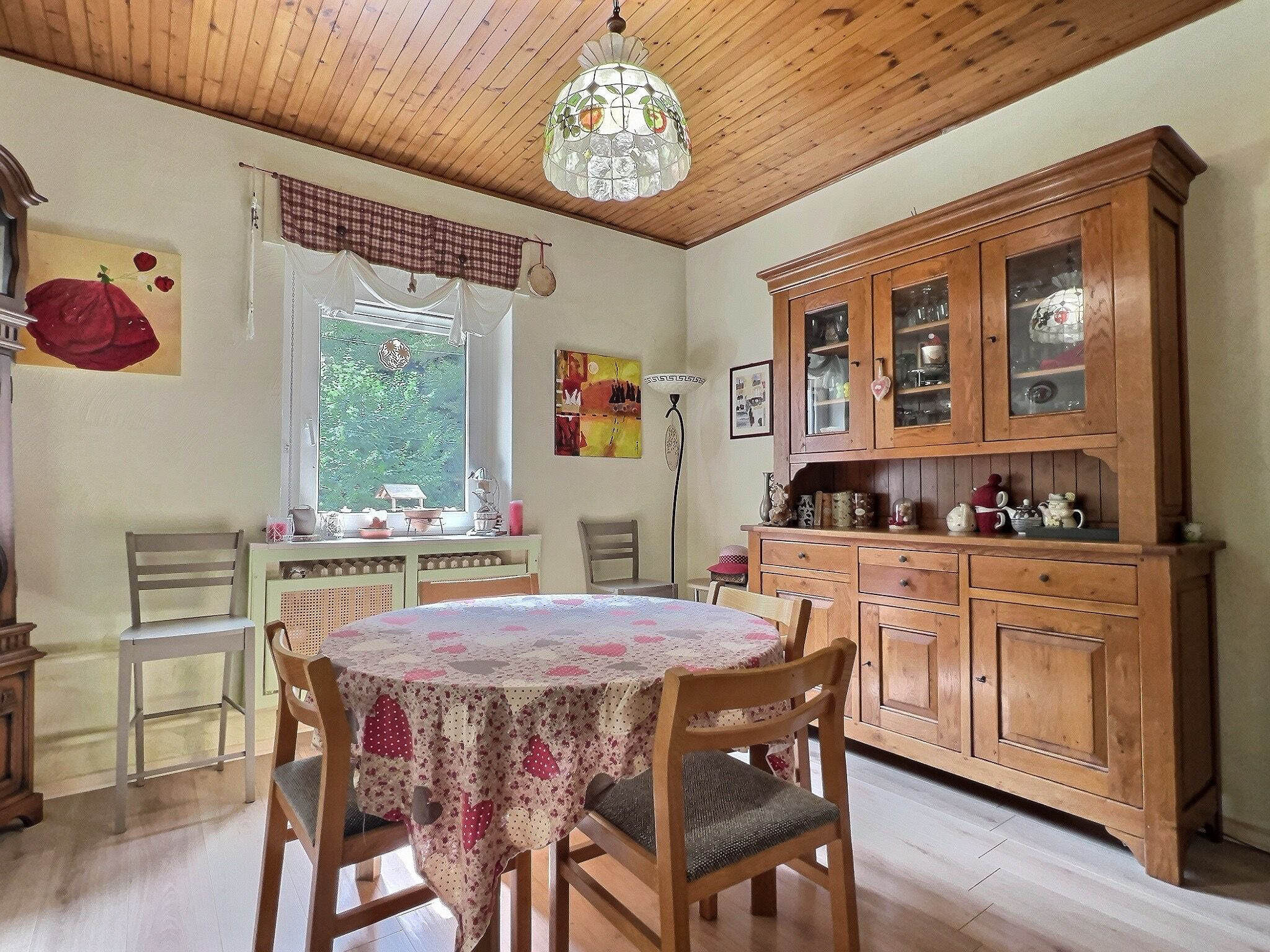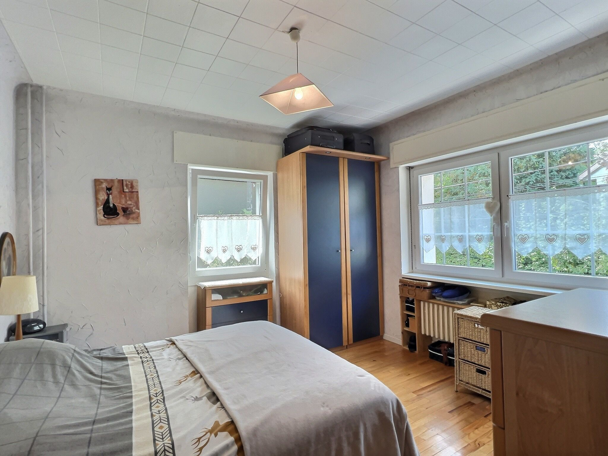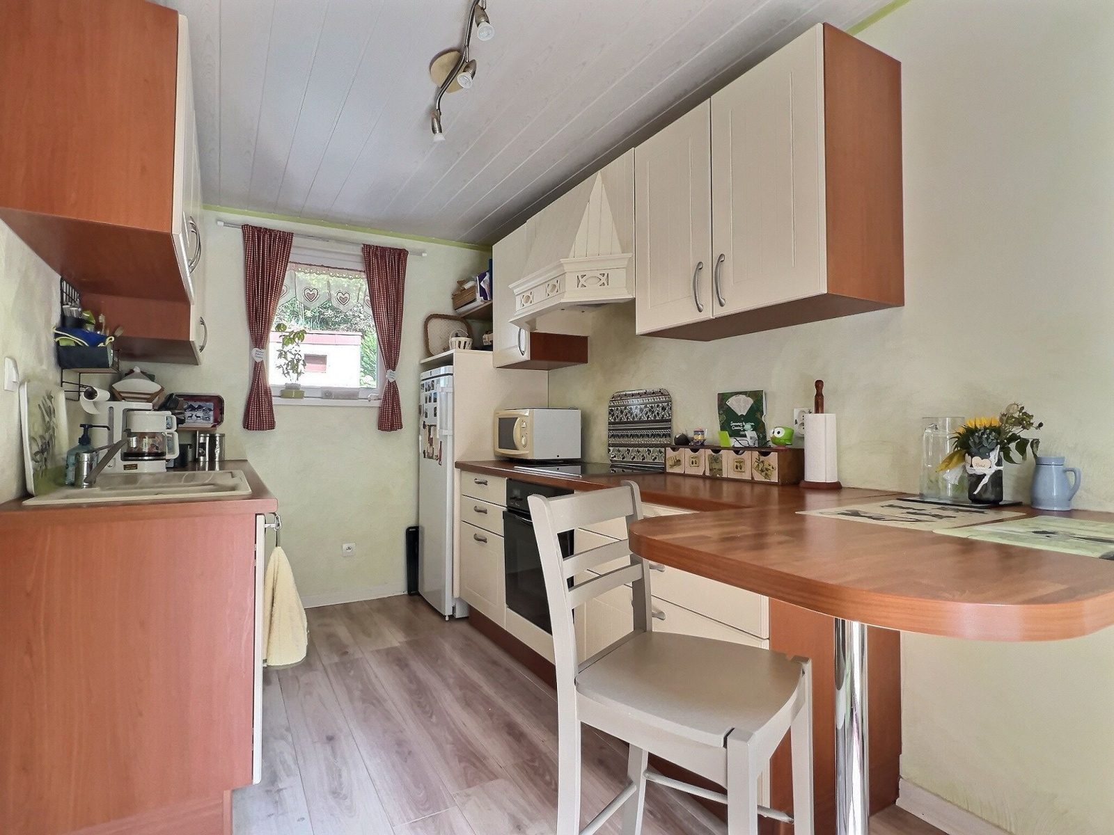 À noter : garage, fenêtres double vitrage, chauffage gaz avec production d’eau chaude, poêle à bois dans le salon, toiture récente. Pas de gros travaux à prévoir.